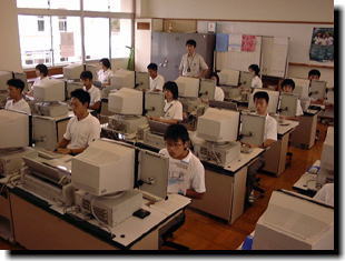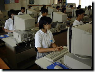 | 当然のことながら、生徒一人一台のパソコンがあります。 授業はもちろんワープロ部でも活用しています。 |