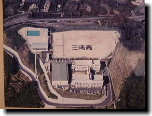 | 昭和34年1月23日 | 全日制課程となる。 この写真は、創立当時のものではありませんが、 昭和40年頃にはほぼこのような配置になりました。 グランドを挟んで、上側が高校、手前の長い建物が 三崎中学校、右側の鉄筋の建物が三崎小学校です。 グランドは、3つの学校が仲良く使っていました。 ![]() |