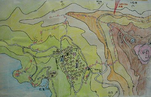 ここで、畑にいたおばちゃんに声をかけられました。「あんたら、どこにいきよるが。」そこで、おばあちゃんに松の八十八ヶ所をまわっていることを説明しました。すると、上の方はとても道が悪くなっていて、歩いていける状態じゃないことと、ハメがいるかもしれない、という事を教えてくれました。それでも、あきらめそうにない僕達に、だいたいの道を教えてくれました。さらに僕達を励ますために、ミカンを一つずつくれました。そしてカマを貸してあげようかといわれましたが、僕達は小さなのこぎりを持っていたので、丁重にお断りしました。