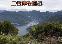 そこを45番〜48番とたどりながらしばらく歩き、49番を過ぎると、ガラン山の中腹を走る道路に出ました。その道路を横切り、再び尾根道に沿って登っていく。50番、51番をチェックして、登り切ると、急に開けた場所に出ました。そこからは、二名津がよく見えます。