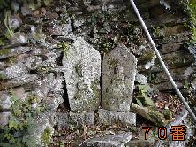そして、63番で一度谷に下り64番〜68番まで松の西尾根沿いに下っていきます。途中でシイタケをつくっているところや、お地蔵さんもありました。松の中腹の車道を横切り、さらに69番〜76番までミカン畑の間を下っていくと、やがて松の集落の最上部にあるT君の家の前に出ました。 そして、人家の間にある、77、78番を通りますが、再び手前の小さな山に登ります。
