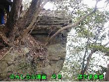 そしていよいよ本題のはちまき岩の調査です。今度は、尾根づたいの道を下山しながらの調査でした。少し下ると、森の中に写真のようなでっかい岩がありました。それが噂のはちまき岩だと思われます。写真のようにせり出しているので、この岩は昔二名津の人家に落ちてくるのではないかと心配していたそうですが、今は木々が生い茂って街からは見えません。